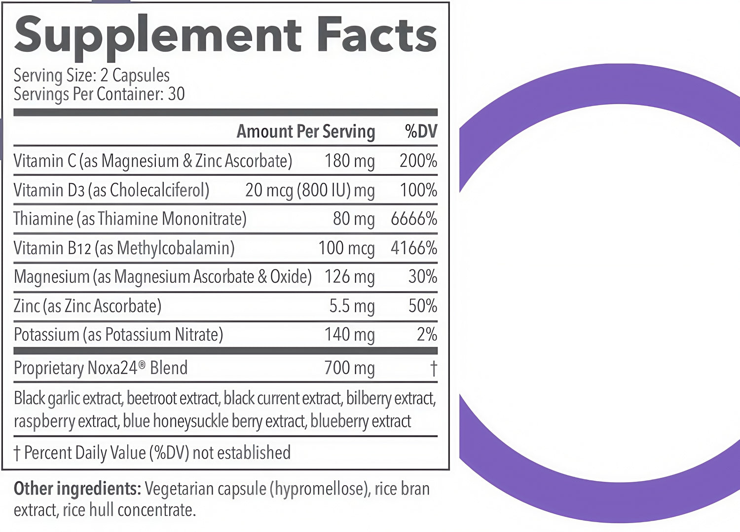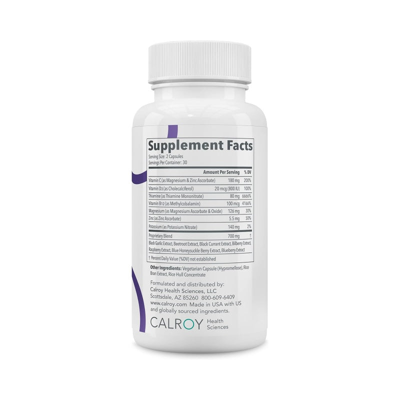 Proprietary blend containing: Black garlic extract, beetroot extract, black currant extract, bilberry extract, raspberry extract, blue honeysuckle berry extract, blueberry extract
